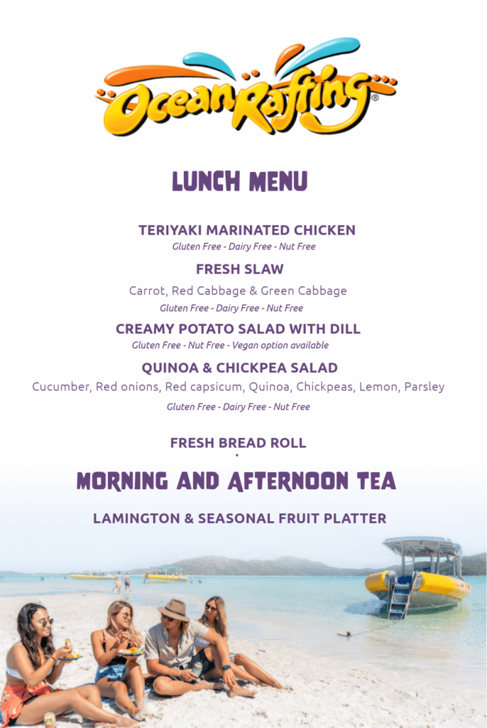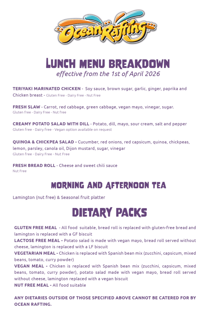 Our deliciously tropical Ocean Rafting lunch option is conveniently provided in individually packaged biodegradable lunch packs. Dietary requirements can be requested and catered to suit dietary needs, or you are more than welcome to bring your own, offering you the choice and flexibility!