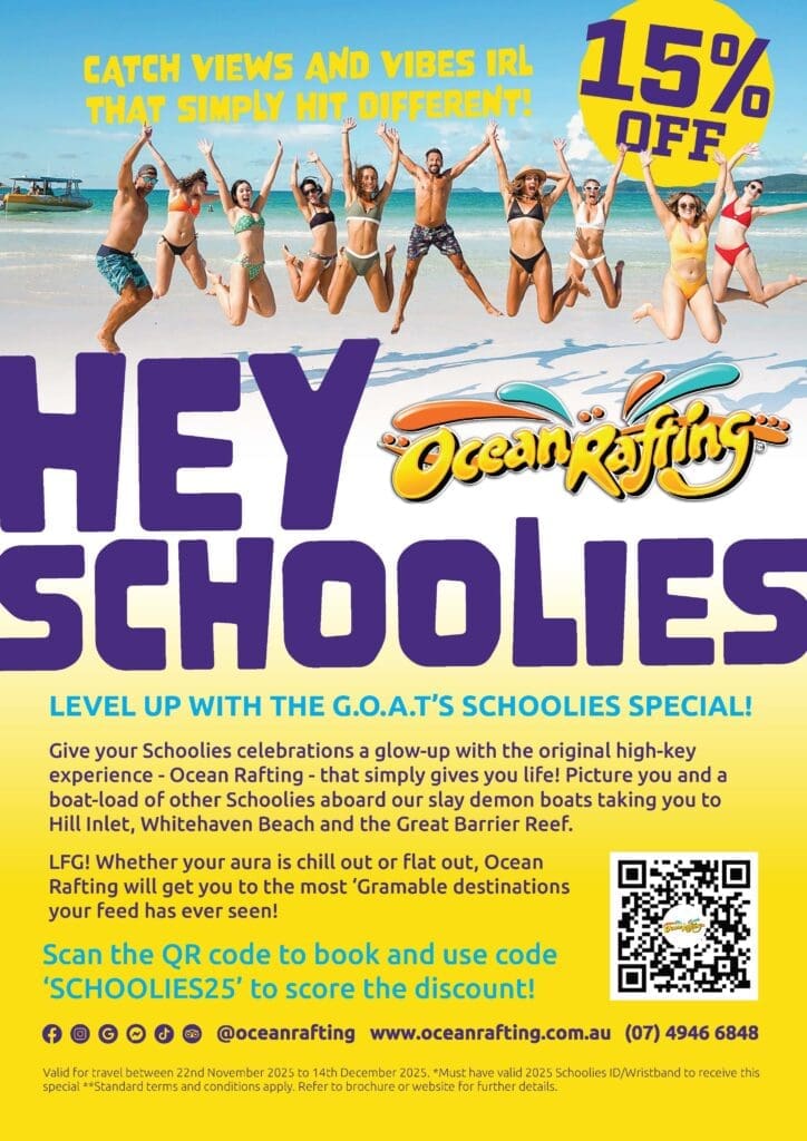 ONLINE BOOKINGS ONLY – Head to www.oceanrafting.com.au and select the tour or package and use promo code “SCHOOLIES2025” on checkout, and your discount will apply to Northern Exposure, Southern Lights, Fly Raft and Scenic Flight.