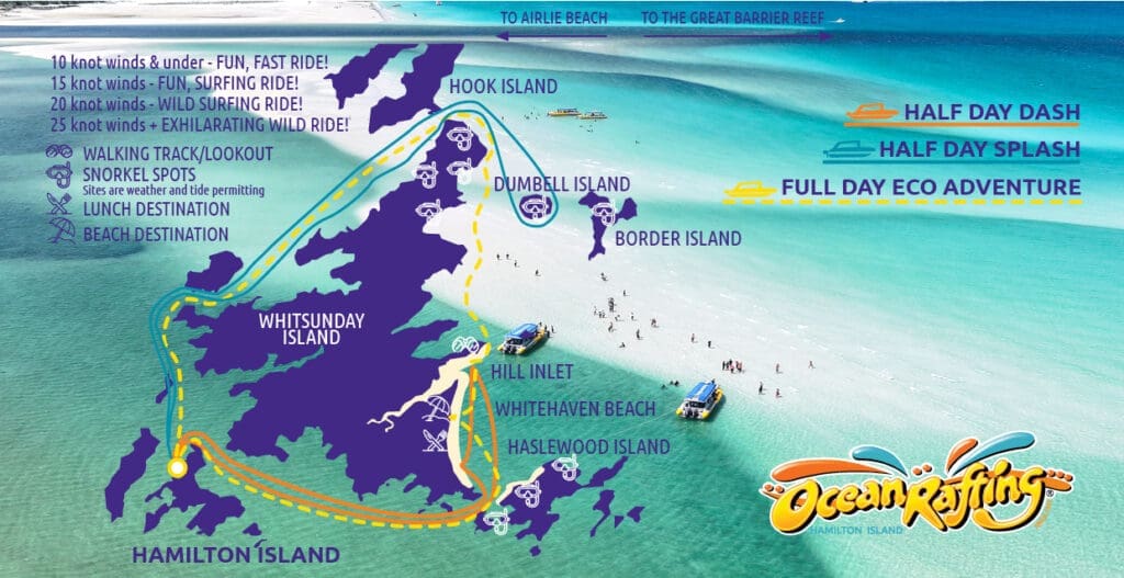 *Please note: The above tour itinerary is a guideline only and is subject to change depending on tide, wind and other weather conditions. Cancellations up to 24 hours before departure date receive 95% refund minus the 1.6% credit card surcharge. Cancellations within 24 hours before departure date are not eligible for a refund. Rates shown are valid for travel until 30 June 26. For travel after that date, relevant rates will display when future dates are selected in the booking table. Tours depart from Hamilton Island Marina, you are required to check-in at our Ocean Rafting Hamilton Island. Please call Ocean Rafting Hamilton Island 48 hours prior to departure on 07 4946 6848 to reconfirm booking details.